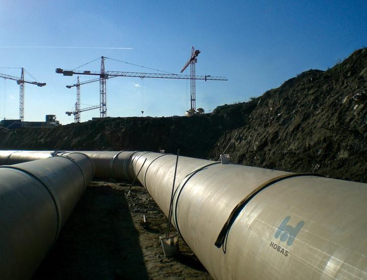 These advantages and numerous industrial projects successfully realized with HOBAS in the past, convinced the client to utilize HOBAS CC-GRP pipe systems for further parts of the treatment plant: A twin line DN 1200, SN 5000, PN 6 leads to the plant from the west and another two paralleling pipelines DN 1400, SN 5000, PN 6 come from the east adding up to a total length of around 2 km.