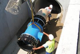 An already established concrete pipeline near Szekszárd transports purified water to the Danube. The hydrostatic and static condition of the line asked for it to be replaced where the line crosses beneath the M6 under the northern junction and exit of the highway. A relatively high salt concentration classified "aggressive II/1" according to Hungarian standards presumed optimal corrosion resistant pipe material. The high ground water levels were another issue which was overcome by pump draining the area through drilled holes along the excavated trench. Heavy rain falls in May did not facilitate this costly task and made a fast pipe installation all the more important. The city Szekszárd’s water company and the contractor COLAS chose the corrosion resistant HOBAS CC-GRP Pipe System for replacing the highway section of the concrete line. Alisca Bau developed a small trolley to speedily transport the light HOBAS Pipes into the 2.2 m concrete tunnel that had been built below the M6.