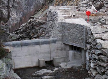 The inlet structure has been built about 120 m beneath the outflow of the Lago di Tomé lake into the mountain stream and embedded in the stony topography of the river course. Clad in natural Ticino stone slabs, the inlet building blends into the environment. The water flows through a rectangular opening beneath the level of the water into the inlet structure, meaning that no flotsam can get into the de-sanding basin (Figures 2 and 3).