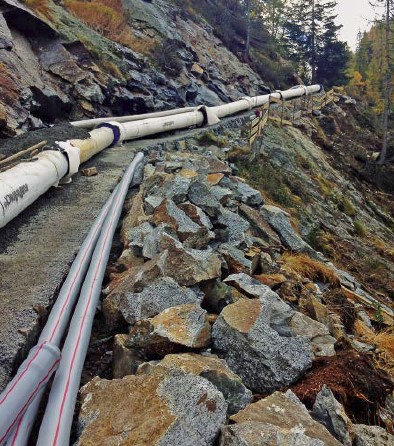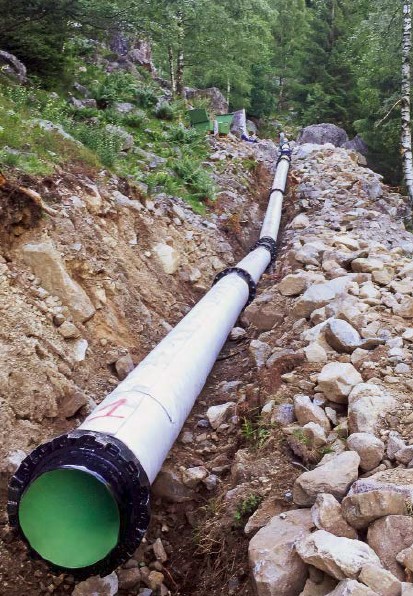 When selecting the appropriate material for the pressure pipeline, the clinching factors were on the one hand the tough installation conditions in the mountains and on the other hand the very high pressures of up to 100 bars with the almost exactly 1,000 m height difference. What was needed was a flexible piping system which nevertheless had to offer outstanding mechanical and static strength characteristics.