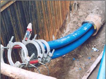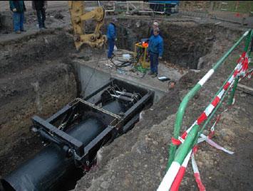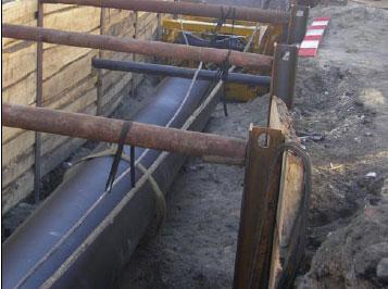 In Steti on the Elbe river in pulp plants industrial water pipelines have been renovated to increase production capacity. Due to high underground and ground infrastructure density trenchless technologies had to be applied. Figure 17-18 presents relining with a PE 100 DN 630 mm pipe and a close-fit Compact Pipe DN 200, where several 45 degree bends had to be lined.