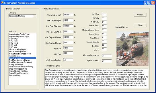 The decision of how to accomplish the installation or repair of a buried pipe in an urban environment involves tangible and intangible parameters. This paper outlines the development of comprehensive, yet straightforward and easy to use interactive software for the evaluation of alternative construction methods that can be employed in the installation, rehabilitation, or replacement of buried pipes and conduits. The software emphasizes simplicity and practicality, and limits input data to those readily available to utility engineers at the design stage of the project. Based on the specific characteristics of the problem(s) facing the decision-maker, the software performs a preliminary screening, eliminating technologies unlikely to meet the project’s requirements. A technical evaluation is then undertaken during which the technical capabilities of the various technologies identified in the first step are compared with the project’s attributes. Next, a risk analysis is performed based on the characteristics of the project's environment and the anticipated soil conditions. The model offers an interactive graphical user interface, and it is compiled as a standalone application compatible with common Microsoft operating systems platforms.