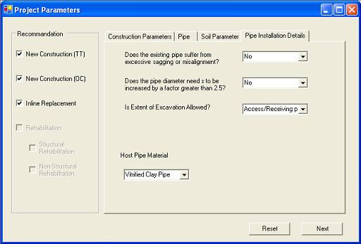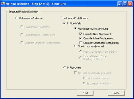 The technical evaluation begins by defining the type of problem the user is facing. It is believed that all buried pipe problems can be reduced to either a structural problem or a capacity problem. U-COMET incorporates a built in wizard, which is based on a series of interactive questions presented to the user. Based on the user's answers, certain categories of construction methods might be eliminated. Figure 3 shows the built in wizard which contains a set of interactive questions for a structural problem.