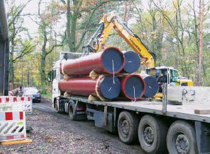 The 6 m long pipes are delivered direct to the construction site by truck where they can be taken off the back of the low-loader by excavators. The pipes can then simply be stored on timbers, sealed in the socket area. Once the sealing ring is in place, the pipes are assembled using pipe-laying equipment/ chain hoists or construction machinery.