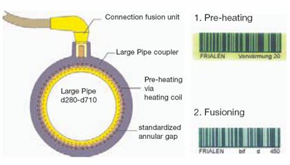 During this pre-heating process a temperature is created in the connection zone via the special parameter which lies below the melt temperature. This heat transfer affecting the pipe surface direct is made possible only by the open, exposed heating coils.