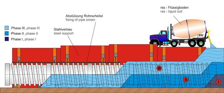 In the last decades there have been many innovations in the field of plastic pipe systems, especially the bauku GmbH had a strong share with developments like the PROFILEEN - safe or the PROFILEEN - drain clean. However in the field of installation methods and installation materials for sewer pipes there has been no real movement until lately the expression "liquid soil" played an important role in more and more symposiums and expert articles. If someone has a closer look at the definition of this word, it is quite clear that this is not a standardized expression for a certain kind of product and that the products of different suppliers have also a much different product behavior. The bauku GmbH faced this challenge and made a first experience in the static design for this application and the practical use at the job site. As such a pioneer work requires a close connection between the pipe producer and the supplier of the liquid soil, the company rss was chosen for the project.