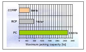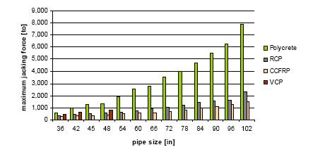2 for the calculation of all 3 different pipe materials independently, and also not taking the different roughness values of the different pipes into account, well knowing that RCP has a much higher roughness than PC. But even without taking this benefit into account the differences in maximum jacking length is significant. More than three times compared to RCP and 4 times compared to CCFRP. (RCP* is calculated on a c-wall pipe according Sherle, and CCFRP according C-Tech data)