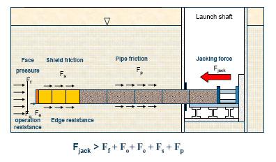 In a pipe jacking operation all jacking forces are generated in the starting pit and have to be transferred from pipe to pipe to the microtunneling machine ahead of the whole pipe string. The resistance force which need to be overcome are split in two areas. The machine area and the pipeline area. On the machine part we have the tunnel face pressure which stabilizes the tunnel face and reduces subsidence on the surface, the operating resistance, which is mostly controlled by the machine operator who controls the slurry system and the steering of the MTBM, the edge resistance and the machine skin friction. On the pipe side, which by far is the largest section, we only have the skin friction. The skin friction is dependent on the friction factor of the material, the surface area and the nominal forces acting on the pipe OD from the surrounding soil.