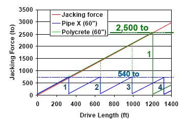 As an example, comparing two pipe materials with the same jacking resistance during a pipe jacking operation, what means that the increase of the jacking forces per increase of drive length is identical. Pipe X (60”) has a maximum jacking capacity of 540 to and Polycrete (60”) a maximum jacking capacity of 2,500 to. That means with use of Pipe X, 4 IJS’s have to be operated, beginning with the first at about 300ft and with Polycrete only one close to the end of the drive.