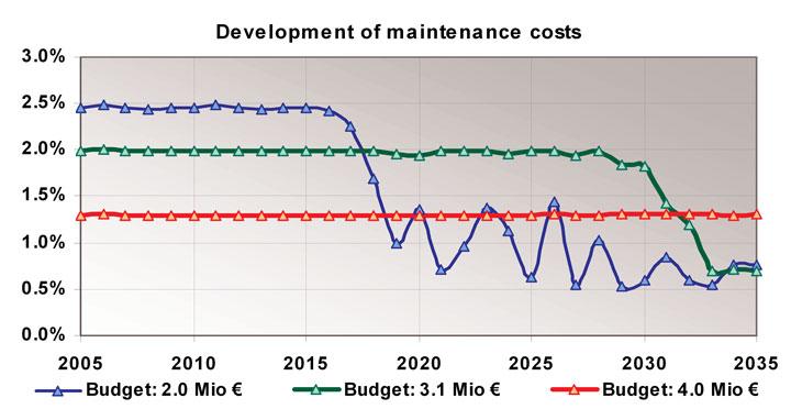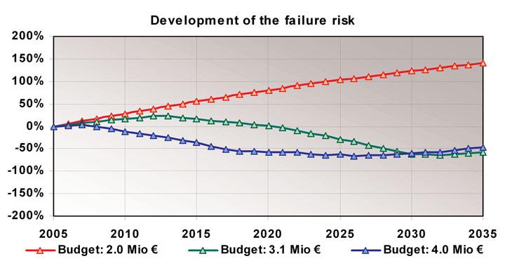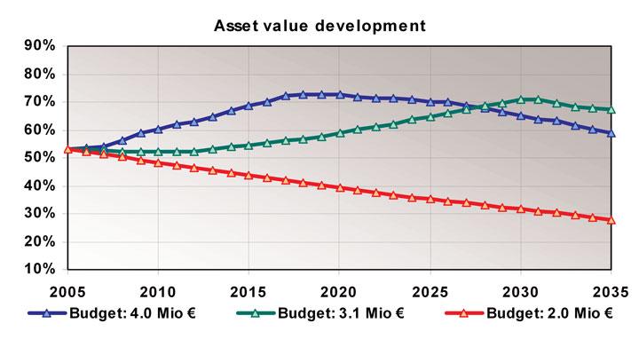 The forecast of the future development of net assets with STATUS is the basis for the analysis of effectiveness maintenance deci-sions. Various key factors like budget size, burst rate, leakage rate, failure risk, ecologic and hydraulic requirements as well as further network-specific limiting conditions allow the definition and analysis of individual maintenance strategies answering questions like the budget needed to hold/ reach a certain service level or how tariffs are affected by defined strategies. Predicting and controlling rehabilitation costs, asset value, failure risks in advance is the main benefit from strategies as well as the information of how key factors of the utility will change by doing nothing or to little. The next figures illustrate consequences of different maintenance strategies, e.g. Figure 8 showing the changes in asset value.