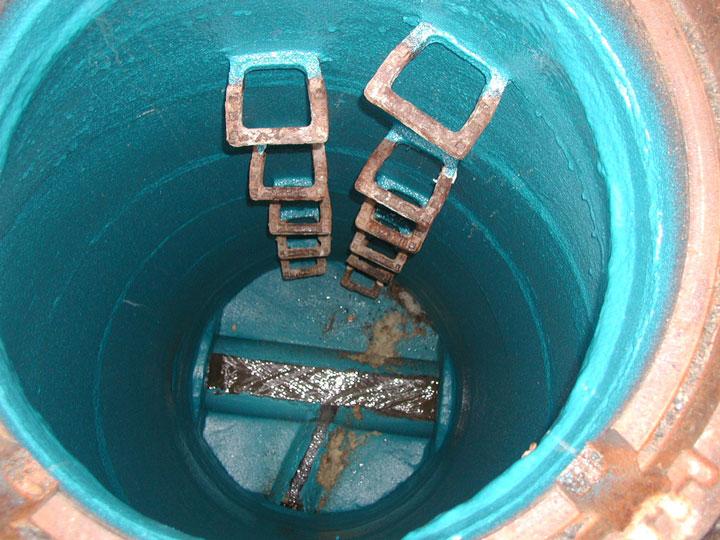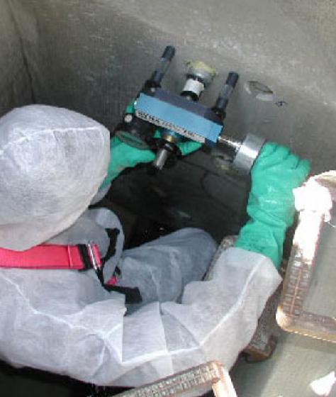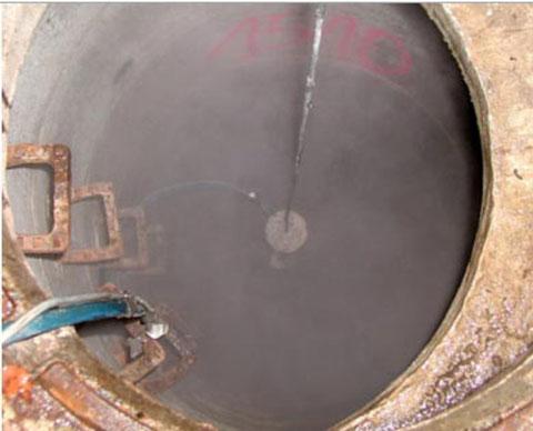 To complement these on-site measures, experiments were carried out in the IKT-laboratories and test facilities. In this way, for instance, the effects of intensive traffic loads on a coated manhole could be simulated or the bonding behaviour of coatings on water-saturated concrete surfaces could be investigated further.