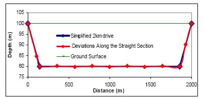 Deviations were introduced to the horizontal section of a previously developed idealised borepath with the use of nodes placed in a quasi-sinusoidal pattern (see Figure 4). The magnitude of the deviations and the spacing between deviations were varied during the investigation. The magnitude of deviations represented in Figure 5 describe the total change in height as the quasi sinusoidal pattern was applied, for example 600mm deviations refer to a ±300mm pattern from line and level.