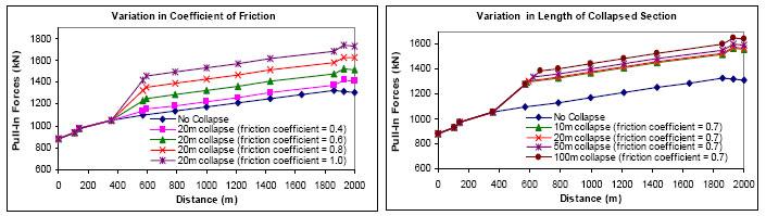 Collapsed sections were introduced with the addition of nodes within a pre-defined borepath and the coefficient of friction was increased between pairs of the nodes. The length of the simulated collapse borepath and the coefficient of fiction within the collapsed were varied, see Figure 6. The length of the collapsed section would appear to be of less significance to the change in pull-in forces when compared to the change in friction coefficient within the bore. Indeed, the change in friction force, even when over a relatively short section of bore in relation to the total length of the drive, has sufficient impact on the pull-in force that the installation could fail in some circumstances.