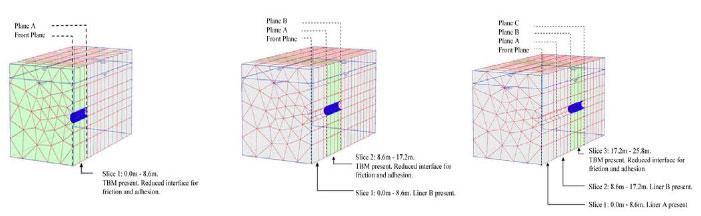 Figure 9 illustrates how the movement of the TBM is simulated within Plaxis. The movement of the TBM is considered in discrete steps; Stage 1 - the TBM is present, Stage 2 - the TBM is moved forward by its entire length, from Slice 1 to Slice 2 and a contraction factor is applied to the rear of the TBM (Plane A) and the rear of the Liner (Front Plane). In addition a reduced interface for adhesion and friction is applied to the soil surrounding the TBM, The initial properties of the liner (liner B) reflect a concrete still in the early stages of curing. In Stage 3 the process is repeated, with the TBM occupying Slice 3, the strength of the lining (liner A) in Slice 1 is increased to reflect changes due to curing of the concrete lining, and an additional section of the weaker lining (liner B) is introduced in Slice 2. The procedure may then be repeated for subsequent stages. As the number of analytical steps increases, additional sections of liner are incorporated within the model and the strength of the existing sections of liner are increased until they reach that of the fully cured material. The outcomes of modelling in Plaxis include normal, torsion and shear forces, bending moments (not reported here) and displacements (see Figures 10 and 11).