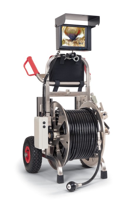 JetCam 40’s 1/2-inch hose comes in lengths from 115 to 190 feet. The system attaches to any 1/2-inch connection delivering water at 2000 psi and 20 gpm. The camera itself measures 1.25 inches in diameter (or 2 inches with optional centering device); offers a 145-degree field-of-view; casts shadowless LED illumination; and can be located using an optional sonde transmitter. High-resolution video with footage superimposed is displayed on an integral 5.6- or 8-inch TFT monitor and output via BNC connector, with options for digital recording (up to 32 GB) and Wi-Fi streaming. JetCam 40's welded stainless steel frame and reel travel to challenging locations easily on pneumatic wheels. The system can be operated upright or lying down. It runs on mains power, or lasts up to 2 hours on an internal rechargeable 12-Vdc battery.