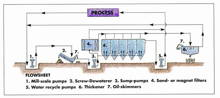 1) Mill-scale slurry is pumped to the screw dewaterer (2). Sump – pumps transport process water to sand filters (4). Water from the sand filters is pumped (5) back to the process via cooling towers. Wash from the continuous washing of the sand enters the thickener.