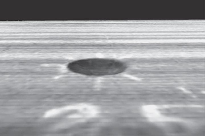 Any anomalies are initially viewed by simply "surfing" through the pipeline. Viewing options include 2D- and 3D-representation as well as wire-frame configurations. The latter enable a detailed inspection of the pipe and the sizing of any flaws found. Figure 3a shows a regular photograph of an anomaly on the surface with a diameter of 25 mm. Figure 3b shows the same defect as seen by the tool and presented in a 2D mode.