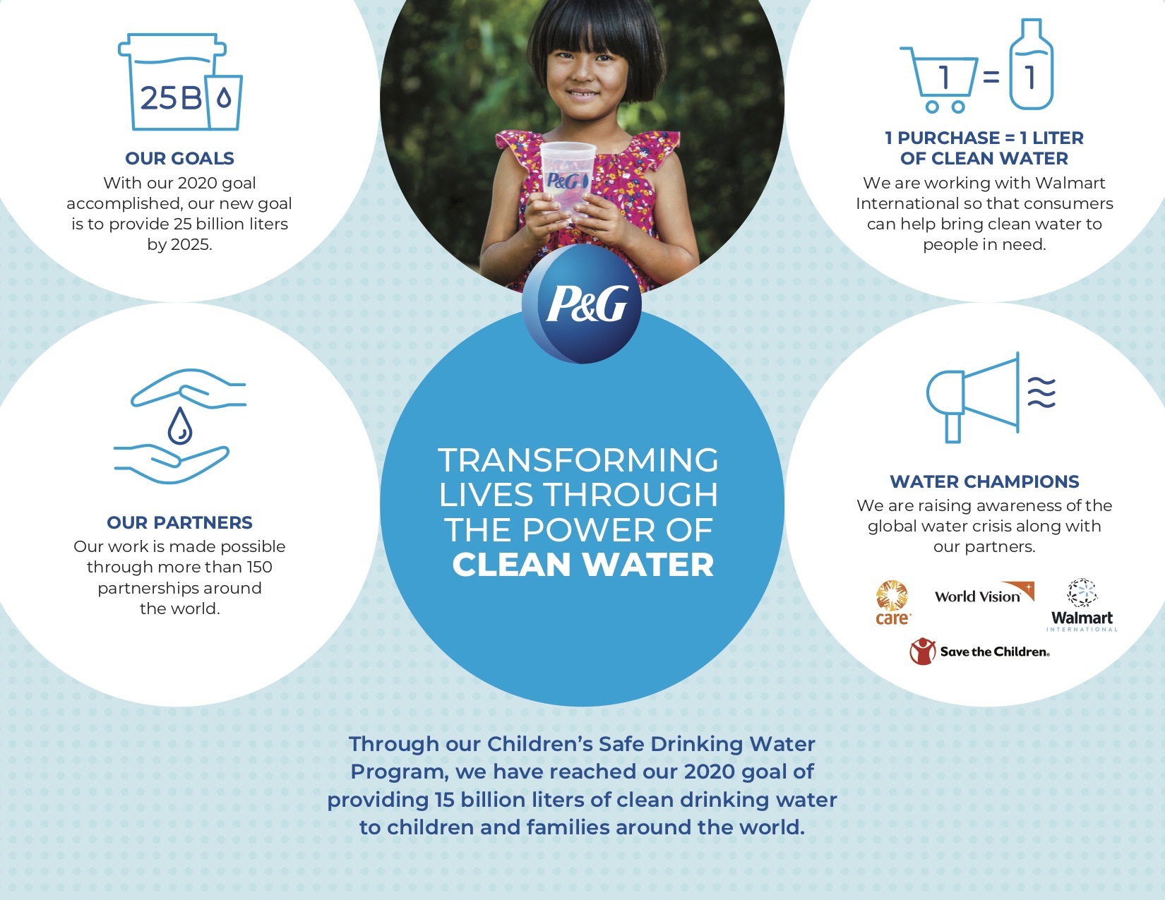 P&G is now accelerating its efforts to help provide clean drinking water to even more people by delivering 25 billion liters – more than 100 billion glasses of water – worldwide by 2025.