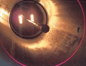 The head of the sonar, its transducer, looks sideways at right angles to the direction of the motion through the pipe, resulting in a cross sectional view of the pipe in real time.