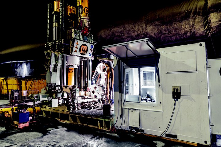 The third machine that is currently biting through the hard rock in Nant de Drance is the new Herrenknecht Shaft Drilling Jumbo. After its commissioning in April 2013, Östu-Stettin Hoch- und Tiefbau GmbH is now working downwards with the machine in two drilling and blasting rounds of 2.5 meters, each with 120 blast holes per day. The Drilling Jumbo will ream the shafts drilled by the RBR (Ø 2,440mm) to a diameter of eight meters using the conventional method.