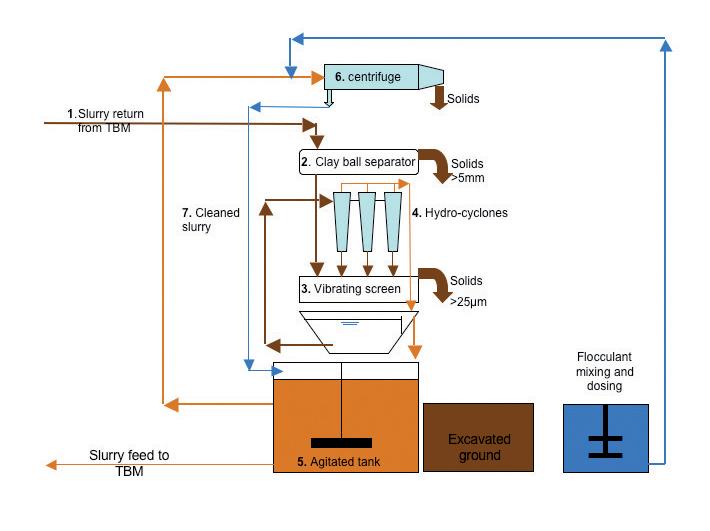 Slurry consisting solely of water would be used on tunnel drives where there are only silt and clay particles in the ground, as the task of keeping the excavated material in suspension is not a problem. In these situations, keeping the slurry clean and as close as possible to pure water (specific gravity =1) is the main objective of the cleaning plant.