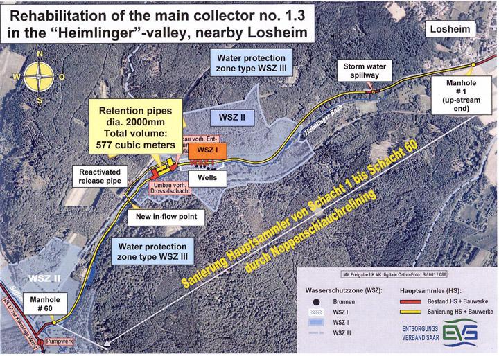 High potential for groundwater pollution The collector "Heimlinger Tal" transports combined sewage from the village of Losheim into South-West direction to the waste water treatment plant of Merzig. TV-inspections performed in 1998 revealed leakages at almost all joint connections of the 3.3 km long section, mainly constructed with asbestos cement pipes ranging from diameter 400mm to 1300mm. Since the pipes themselves were still in excellent condition, rehabilitation would not have been necessary under structural aspects.