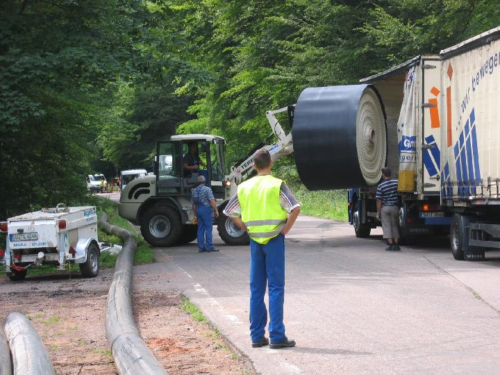 Due to its exceptional size, the rehabilitation of the retention pipe dia. 2000mm caused massive interest among experts and decision makers of the surrounding municipalities. Two job site presentations were therefore held during the project execution. At the first presentation date, held on 16th May 2008, visitors were given the opportunity to get a picture about the application of state-of-the-art rehabilitation methods for large pipes. The insertion of a pre-welded Preliner was demonstrated "live". Presentations by the responsible project engineers of the customer EVS, the consultant Schweitzer GmbH and the system-applicator Trolining GmbH concentrated on all relevant aspects.