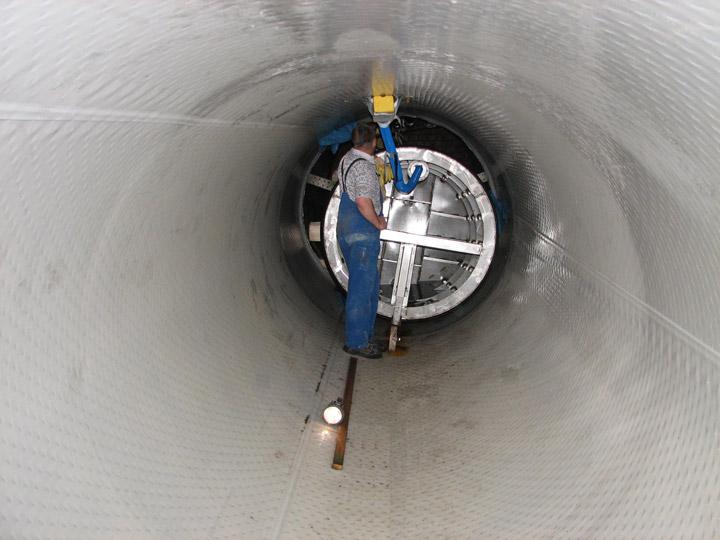 Grouting of the annular space was performed under application of the specific Trolining mixing-technology by using 3 mixing units. First the outer and then the inner annulus were filled. After curing, the supporting water pressure could be released from the liner and the sealing plugs were removed (Figure 4). As a final step, the lining system was cut-back flush to the manhole chamber walls and the space between the HDPE-liners was sealed with a multi-layer PE-weld to guarantee water-tightness (Figure 5).