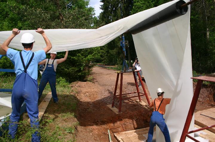 Every liner is tailor made according to the exact measurements taken on the job site. That procedure guarantees the systems "Close-fit" characteristics, thus limiting the cross sectional reduction to an absolutely minimum. Prior to the liner insertion, the pipe section to be rehabilitated is plugged-off at both ends, cleaned and visually inspected. A cable winch is then used to unroll each HDPE liner from its transport drum and draw it through the line into position. After insertion, all HDPE liners are welded together at their both ends. The resulting liner –"sandwich" is then inflated with a defined pressure through passages in the temporary plugs closing the ends of the liner section.