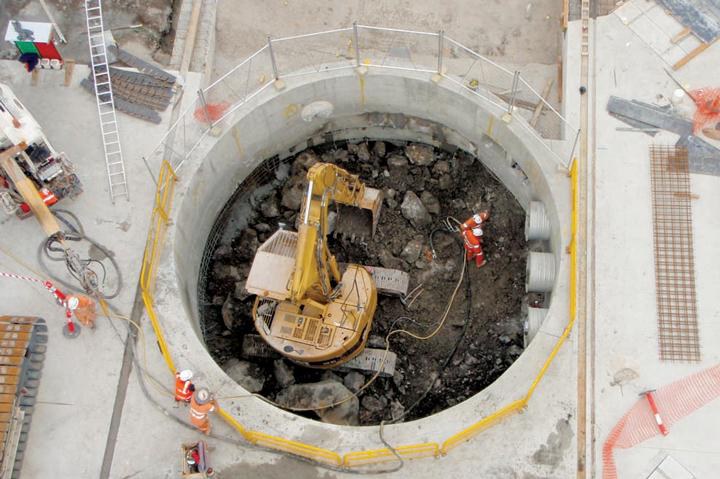 The Robbins TBM will be launched from a 35 m (115 ft) deep shaft at the compact Newlands Road job site. The machine will utilize 17 inch cutters to bore through basalt rock ranging from 60 to 270 MPa (8,700 to 39,200 psi) UCS. As the TBM bores, full muck cars will be hoisted up the shaft and side-dumped into a spoils bin for removal by rubber-tired vehicles. Launch of the TBM is scheduled for late August 2008, after fabrication and assembly in the Robbin's Solon, Ohio, USA facility.