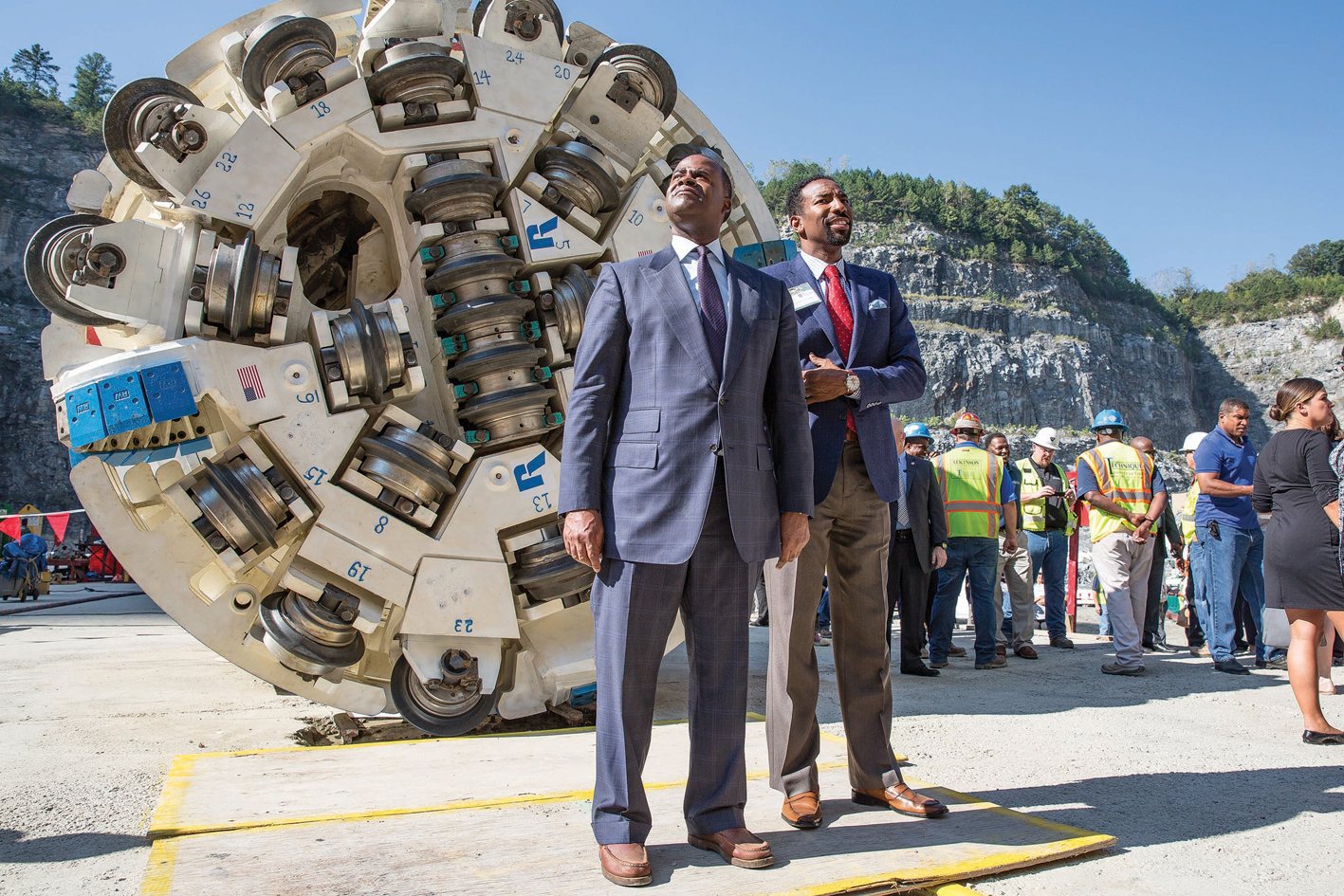 After an Onsite First Time Assembly (OFTA) lasting just 2.5 months, Atlanta Georgia, USA’s newest TBM, dubbed “Driller Mike”, made its initial startup on October 13, 2016 and ramped up to full production two weeks later. Atlanta’s Mayor Kasim Reed and city officials gathered with local and national media to celebrate the occasion. The 3.8 m (12.5 ft) diameter Robbins Main Beam TBM is now boring the 8.0 km (5.0 mi) Bellwood Tunnel after being walked forward 100 ft into a starter tunnel.