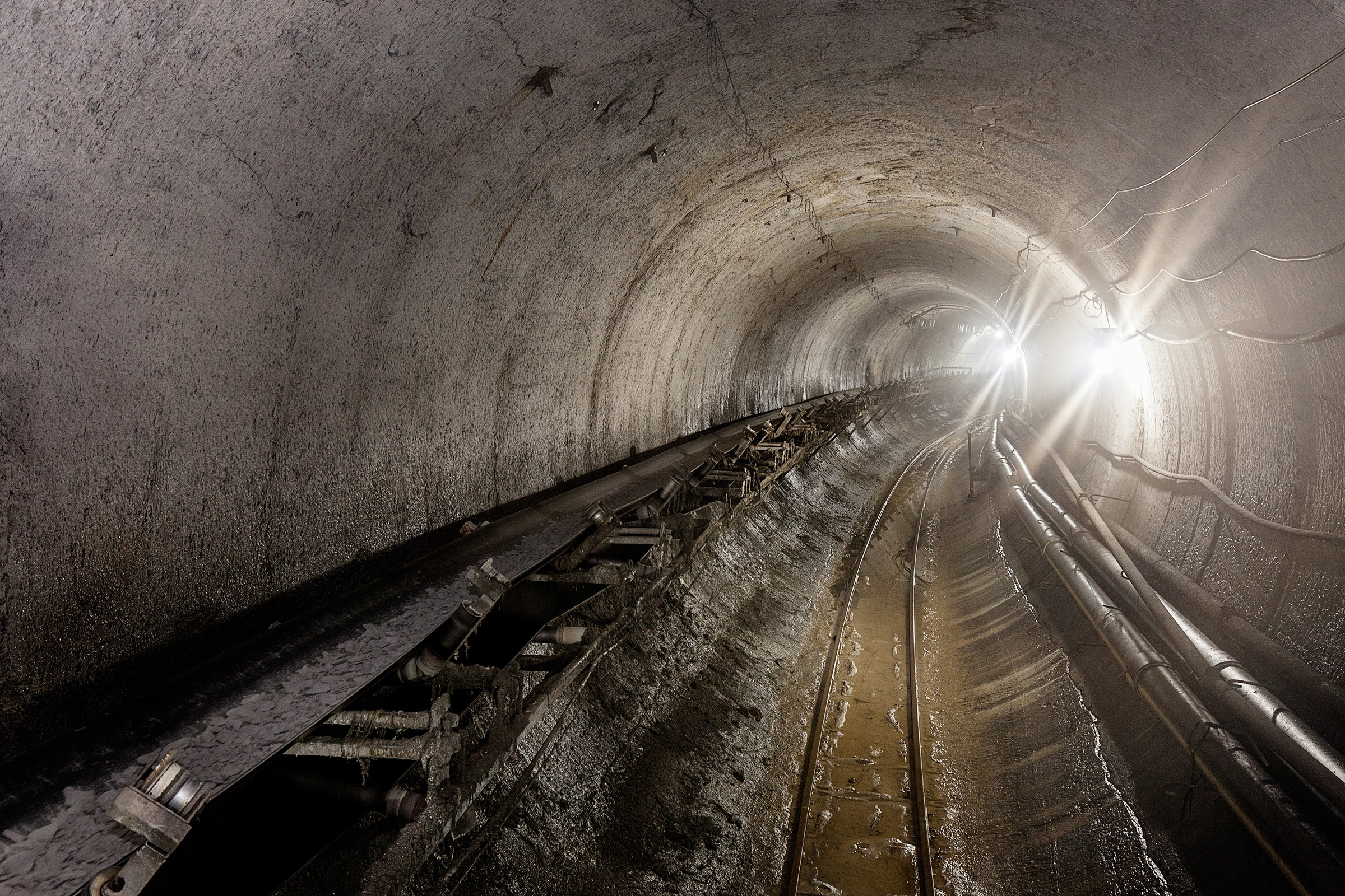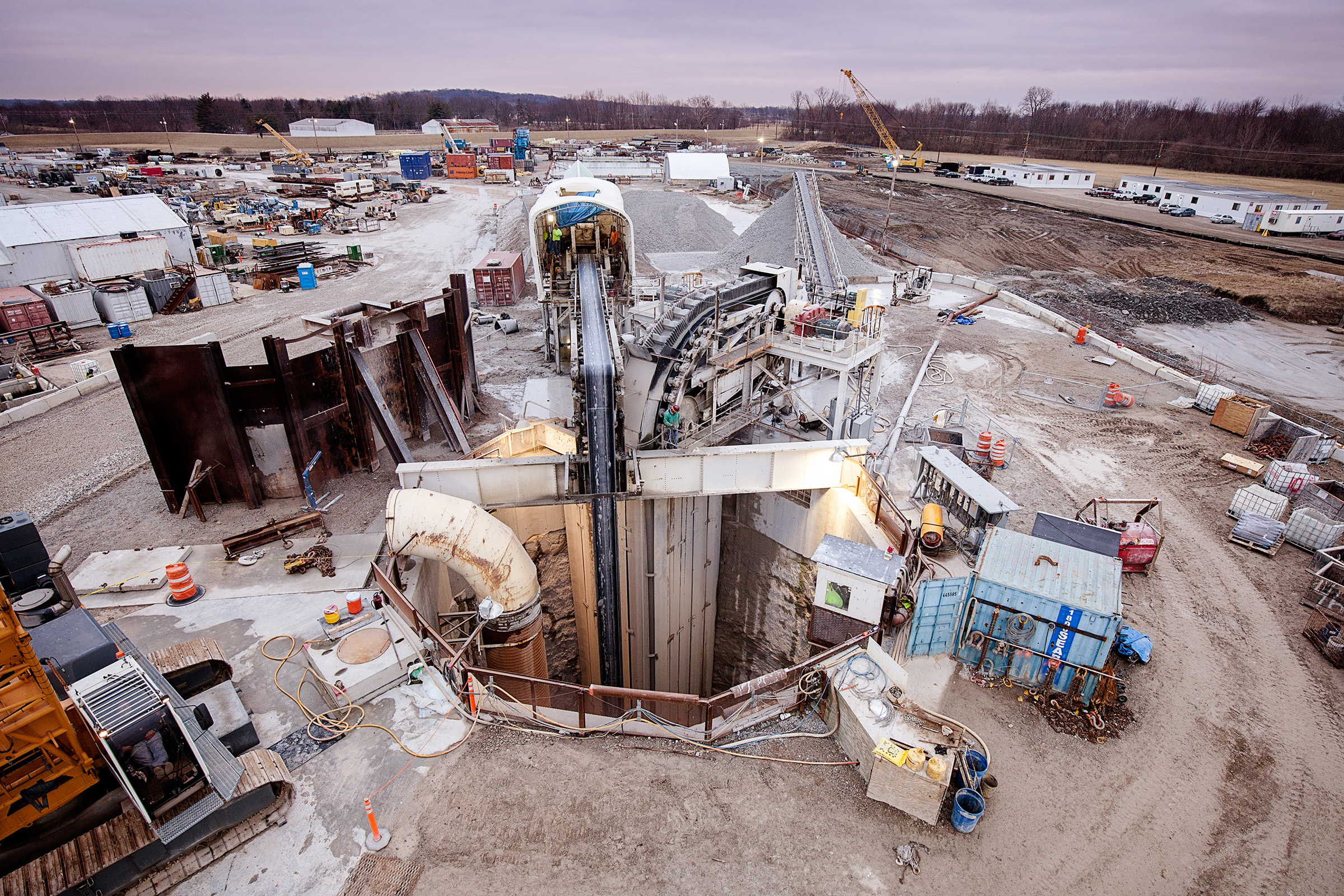 Another important element that helped the speedy machine achieve a fast advance was, as Lipofsky put it, "one of the most complex continuous conveyor systems in North American tunneling construction." The custom-built Robbins system, consisting of 25 km (82,000 ft) of belt, included horizontal and vertical conveyors for efficient muck removal. The system was the first built by Robbins to go through such sharp curves: "The belt is going through two 90-degree curves in opposite directions and S-curves in other places. It’s very unusual and amazing to see a belt system perform as well as this one did," said Lipofsky.