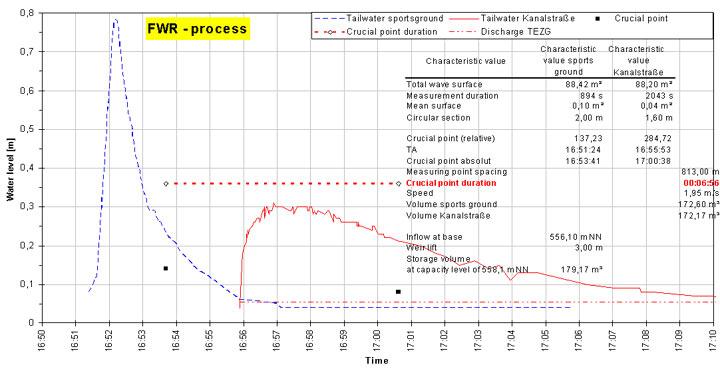 The FWR process is certainly also analytically transferrable to all current section shapes without any major problems involved, ranging from a rectangular section to a circular one and any other special types, whereby after each cyclical measurement of the wave height in the section shape (KP) the pertaining areas of partial fill are calculated and taken into account in the given SWL process formulae in lieu of the wave heights. A corresponding evaluation of the test in the main sewer of the City of Mengen/Danube is given in Pic. 3.