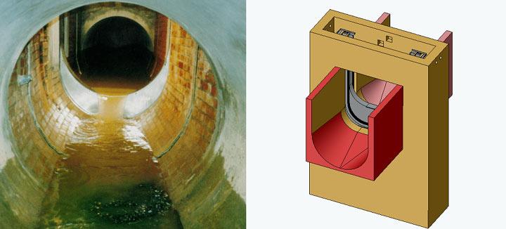 2.3 Cleaning large diameter pipe sewers with conventional high-pressure flushing equipment is only partially feasible and continues to be extremely costly. Possible damage as a result of using high-pressure flushing equipment cannot be excluded and fresh water required for the flushing must subsequently also be treated in the sewage treatment plant. As a general rule the sewer network should be cleaned at least once a year, although as most communities continually discharge waste water, this largely prevents optimal cleaning, especially in the base area. This particularly applies to checking socket sealings and possible material defects in the vicinity of the permanently wet area. Interruption of the sewage flow for monitoring, maintenance and rehabilitation purposes is therefore essential, particularly in large diameter pipe systems > 1.2 m. It is also generally known that installation of valves as cut-off instruments in combined sewer systems where there is a sedimentation hazard also entails considerable problems.