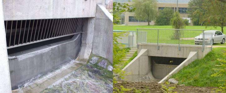 Discharge weirs have the task of activating cascade volumes up to a predefined storage level and to discharge surplus stormwater into the receiving water by lowering the weir edge (Pic. 7). The construction features of discharge weirs correspond to those of the cascade weirs in which the lift velocity is between 10 to 30 cm/min. The measurements of discharge weirs are: width = 1.20 m to 7.70 m at a maximum lift of approximately 3.00 m.