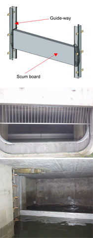 4.7 Floating scum boards according to the German patent DE 3503407 offer the advantage that floating materials throughout the entire area of varying water levels can be retained by combined sewer system overflow installations. Tipping of the floating scum boards is excluded as they travel in corresponding channel section grooves, ball bearing-equipped.