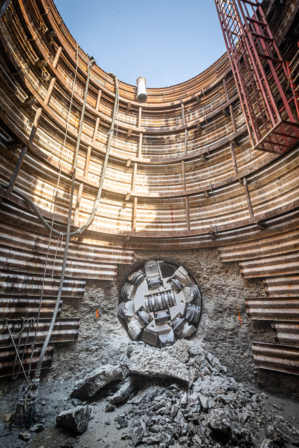 The majority of the tunnel used a simple two-rock-bolt pattern for support. In the last 10% of the tunnel, ribs and lagging were used as support. Final carrier pipe, which is now being installed, consists of 110 cm (42 in) diameter fiberglass pipe.