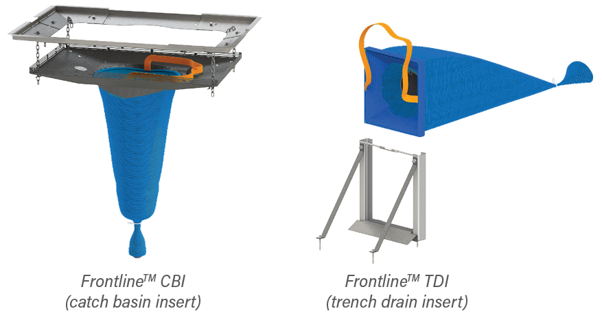 Its flexible design fits under the existing storm grate in a drop inlet or a trench drain configuration. Frontline is easy to install—just insert the frame and pollutant filtration devices into your existing storm drain inlet.