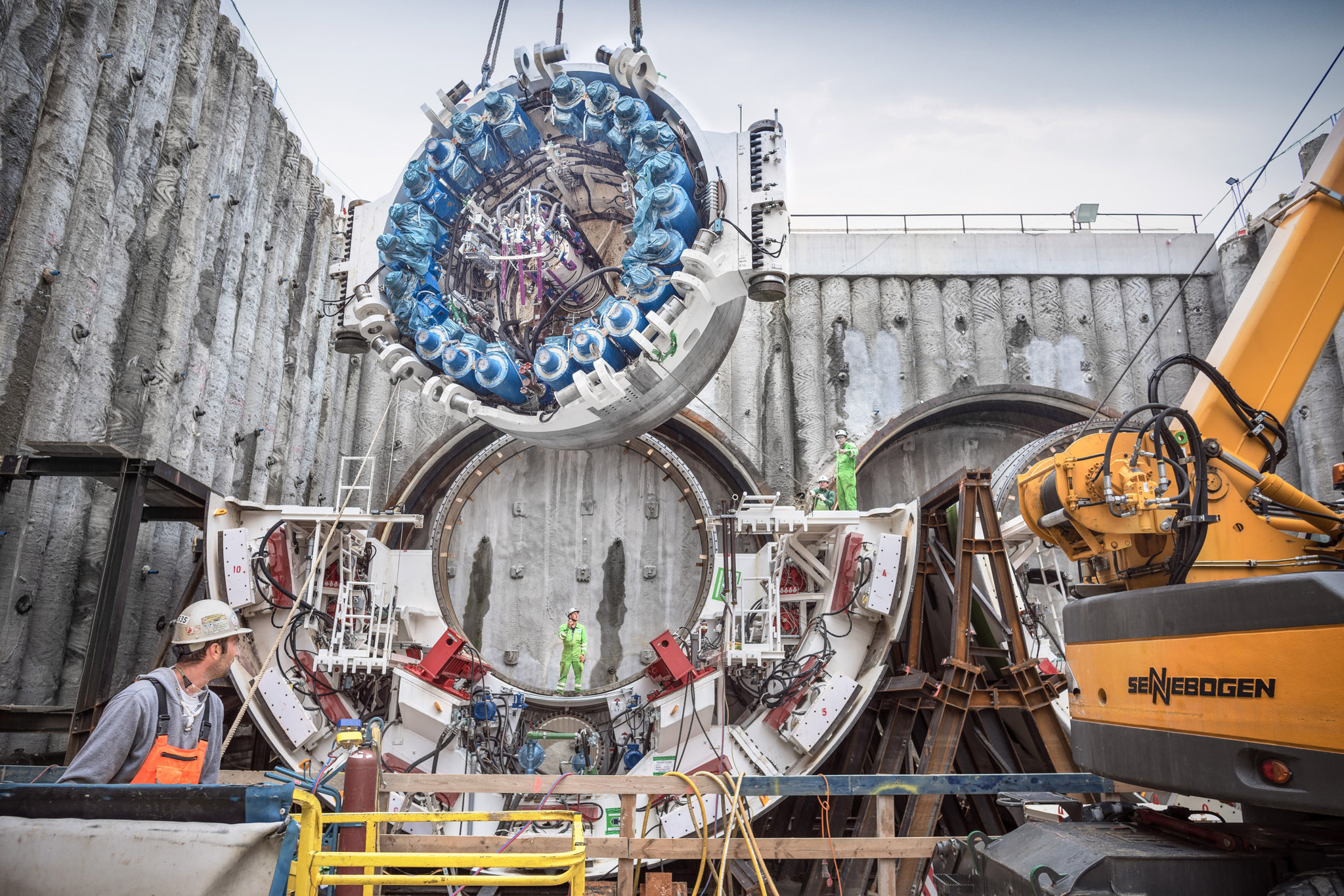 The schedule for jobsite assembly stipulated that both machines should be assembled in the narrow launch shaft at the same time: with a diameter of 10.82 meters and only a few meters between the machines, this was a tricky job. A crew of 20 specialized Herrenknecht experts assembled both TBMs at the tunnel's eastern portal near Kirchheim unter Teck. In doing so they followed a detailed plan, according to which the assemblies were gradually pre-assembled in the site equipment area and lowered into the narrow launch shaft for final assembly.