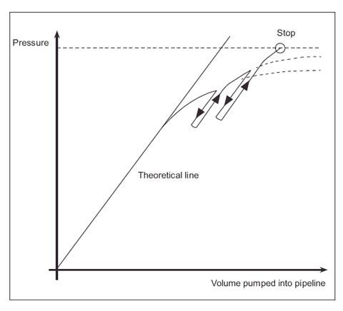 A quantified (interrupted) stress test with "training effect" can be seen in Figure 2 . This type of stress test is used when the objective is to achieve particularly high pressures while minimising permanent expansion in circumferential direction in order to eliminate defects. Further areas of application refer to pipelines made of materials with specific expansion properties or pipeline sections involving major height differences. The figure shows that this method allows higher pressures to be reached with lower permanent pipe expansion.