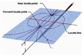 The forward and rear locate points as the names indicate are found in front of and behind the transmitter which are directly above the transmitter axis or stated differently, they define the transmitter axis. The locate points are found where the flux lines are vertical. When the transmitter is level, these are equidistant from the center of the transmitter antenna and the distance between the locate points is 1.4 times the transmitter depth.