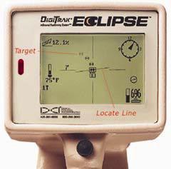 Due to the three dimensional antenna design it is possible to display the transmitter or locate position in real time. This means that the locator is able to watch the locate point, or more appropriately its graphical representation, move as the drill head moves through the ground. Figure 4 shows the main locating screen of the Eclipse system. The "Target" is the graphical representation of the locate point. At the center of the display is an icon representing the receiver itself or alternately the position of the locator holding the receiver. In Figure 4 the faintest target (the one the red line is pointing to) indicates that the locate point is out in front and off to the left of the locator. By moving the receiver in that same direction the ball can be seen traveling along the path taken. Remember, in this case the target (locate point) is stationary and the moving ball represents the movement of the locator. Once the target has been placed in the receiver icon at the center of the display the locate point has been found. The locator now has very accurately determined the direction of the transmitter and hence the drill head. The figure also shows the locating line, which represents the center of the transmitter or drill head, overlapping the target. This is for illustration purposes only since the receiver can obviously not be over the locate point and drill head at the same time. By lining the locate line up with the horizontal cross hairs in the display and using the locate point as a guide, the receiver is then being held directly above and in line with the head. Now, a depth reading can be taken.