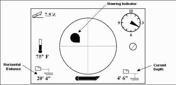 In situations where walk over locating is not feasible or practical, for example when crossing a busy roadway, target steering is a locating method that can be used. As an example, assume that a 10 m (33 ft) wide road has to be crossed and that the bore plan calls for a depth of 3.5 m (11.5 ft) on the far side of the road. The 3.5 m (11.5 ft) depth can then be programmed into the Eclipse receiver as a target depth, and the receiver can be placed on the far side of the road. The horizontal angle of the receiver is of importance since the steering information will guide the drill head directly below and at a right angle to the receiver. With the receiver programmed for a target depth and placed on the far side of the road, figure 5 depicts the view of the remote that the operator on the drilling machine will have. The drill head is 6.2 m (20.3 ft) behind the Eclipse receiver as indicated by the horizontal distance display. The drill head is calculated to be 1.4 m (4.5 ft) below the plane of the receiver. The steering indicator shows that the current drill head position is little bit above and somewhat further to the left of the target represented by the center of the cross hairs. The object is to steer the tool so the steering indicator moves to the center of the cross hairs. The proper steering command for this is to bring the head down and to the right. Experienced drillers know that this is about 4 o’clock. The point on the steering indicator mirrors the clock orientation of the drill head so by rotating the head until the point is aimed at the center, the proper steering can be done. In addition, the pitch reading is continuously updated so that the drill head inclination can be maintained during drilling. In this fashion, the roadway in our example can be crossed without risking injury to the locator or having to divert traffic.