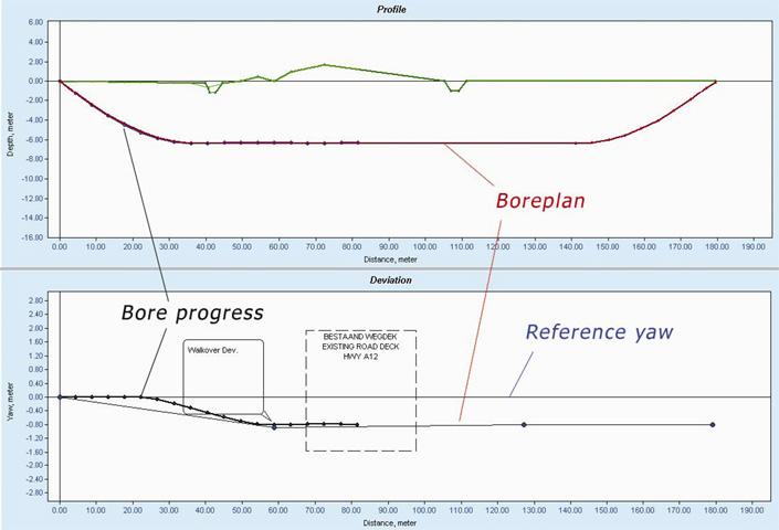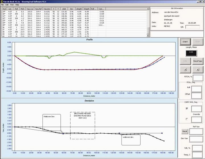 Figure 6 shows a view of the bore as it appears on the laptop during the pilot bore process. The screen displays much more detailed information but for the sake of clarity, this has been omitted. The upper portion shows the profile and the lower is the top view of the bore showing left/right deviation. The bore plan and the topography survey information have been preloaded into the SST software. In the figure the bore is about halfway completed. The software allows the drilling crew to monitor the progress and make corrective decisions if required. The Eclipse remote when operated in SST mode displays the roll, inclination, compass heading (yaw) and the deviation (if any) from the reference yaw are displayed. Reference yaw is defined as the establish heading of the bore plan. As the tool deviates from this heading, the remote will display a left/right deviation in degrees indicating how much off course the tool is. A case history later on describes the A-12 highway crossing near Driebergen in the Netherlands using the SST system.
