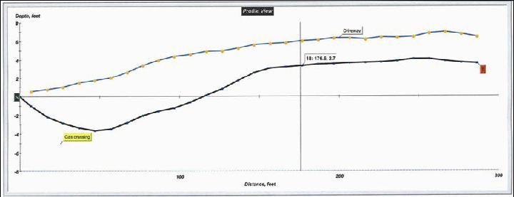 Dakota Directional out of Ennis, Texas is a contractor working on a large FTTP (Fiber To The Premise) project for the Verizon telephone company. On January 18, 2005 they set up to do a fairly typical bore on this project using their Vermeer® D16x20 drilling machine. The project was to install a 90m (290 ft) of 50 mm (2”) HDPE conduit at a depth of 0.9 m (3 ft) for a fiber optic line in a residential area. The bore was drilled at an upward slope generally following the surface where the elevation at the end of the bore was about 1.9 m (6.2 ft) higher than at the entry point. Ground conditions consisted of loam, some clay and a rocky section at the beginning of the bore. With the dual frequency Eclipse transmitter running in dual frequency mode the Eclipse DataLog feature was used to document the bore. Figure 9 shows the bore profile after downloading from the Eclipse receiver on the computer using the Eclipse DataLog software.