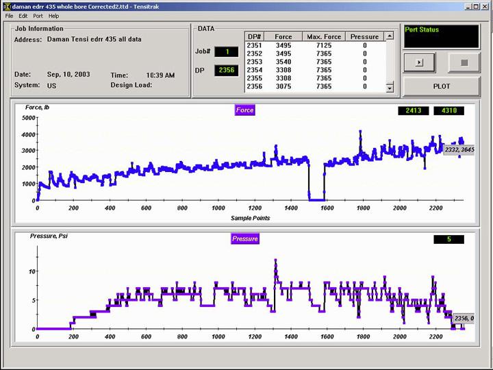 In September 2003 a test bore took place in Rome, NY intended to test the tension load and drilling fluid pressure capabilities of the TensiTrak system. The bore in question was 140 m (460 ft) long and with a maximum depth of 4.3 m (14 ft) and included pulling back a 150 mm (6 in) HDPE pipe. Ground conditions ranged from fine to silty sand. The drilling fluid test consisted of starting with a typical drilling fluid mixture for these conditions (75 second) and about half way through the bore, the drilling fluid was changed to a thicker fluid (153 second) while observing the results. Towards the end of the bore, a Baroid product called AQUA-CLEAR™ PFD was added. This is a Phosphate-Free Dispersant which primarily affects the drilling fluid viscosity by acting as a thinning agent. The tension and fluid pressure data was logged and Figure 11 shows the results as displayed in the TensiTrak software. The tension load continued to rise almost linearly through out the bore ending at about 15.5 kN (3,500 lb) while the pressure data ran between 41.4 and 55.2 kPa (6 – 8 psi). At data point 1500 the drill pipe was pushed back a bit and the tension load went to 0 as expected.