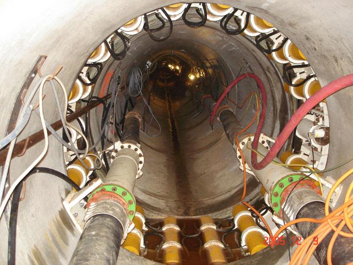 The automatic full-face cutter Herrenknecht AVN was used which had been modified for this particular application. The press capacity of the plant amounted to 1,200 tons. Here, an automatic annulus lubrication was very essential for this project. A separation plant equipped with mud screens and hydrocyclones provided by the company Schauenburg allowed a fast and clean preparation up to a cut point of 40,000 mm. The MAB performed 400 cubic meters per hour. The company Gollwitzer supplied the ferro-concrete drivage pipes (inside: DN 2000, outside: DN 2400). Intermediate jacking station provided by the company Gollwitzer were inserted along the drift.