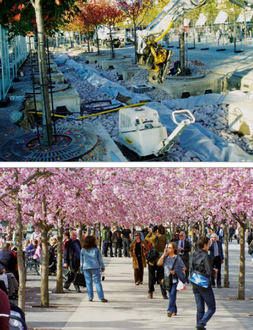 Figure 2 (top) shows an example of a coarsegrain crushed substrate, which ensures sufficiently large pore space for rainwater and tree roots, is capable of being highly compacted and, after completion, allows full use of the surface (Figure 2, bottom) [5].