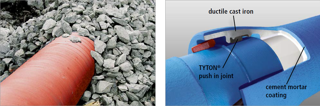 Figure 4 (left) shows an example of the installation of such pipes in rocky bedding materials. Figure 4 (right) shows a ductile iron pipe with cement mortar coating and a TYTON® push-in joint.