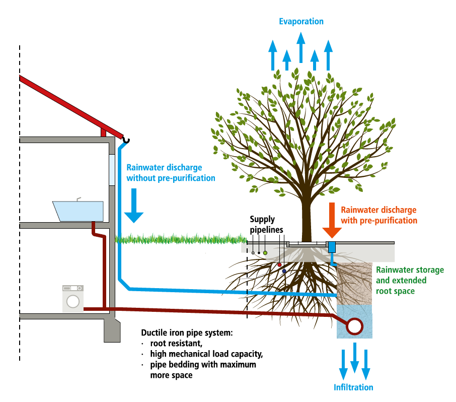 The integration of this soil-pipe-system in an urban environment is illustrated in Figure 6. The pipe trench with the ductile iron pipes becomes a storage space for rainwater beneath the road. Water from non-polluted surfaces such as roof spaces (apart from roofs covered with copper or zinc) can be directly discharged into this storage space. Polluted rainwater is first pre-treated and then discharged into the rainwater storage space. For pre-treatment, systems available on the market with DIBt certification can be used for example. The water is used either for irrigating the tree roots growing in the pipe trench or it trickles away as in an infiltration system. The decentralised storage, infiltration and evaporation of rainwater at the place where it falls has a number of positive effects:
